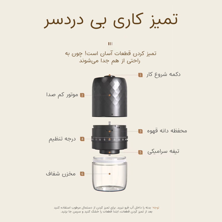 تیغهی سرامیکی مقاوم این دستگاه بدون ایجاد حرارت اضافی، دانههای قهوه را کاملاً یکنواخت آسیاب میکند. این ویژگی باعث میشود طعم و عطر طبیعی قهوه حفظ شود و هیچگونه بوی سوختگی یا تلخی ناخواسته ایجاد نشود.